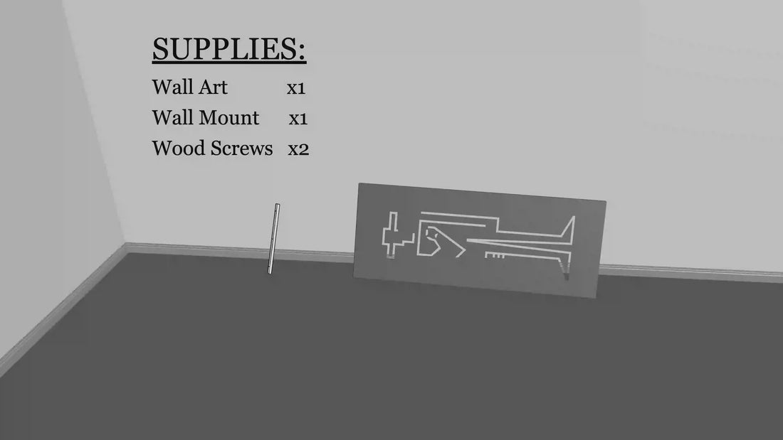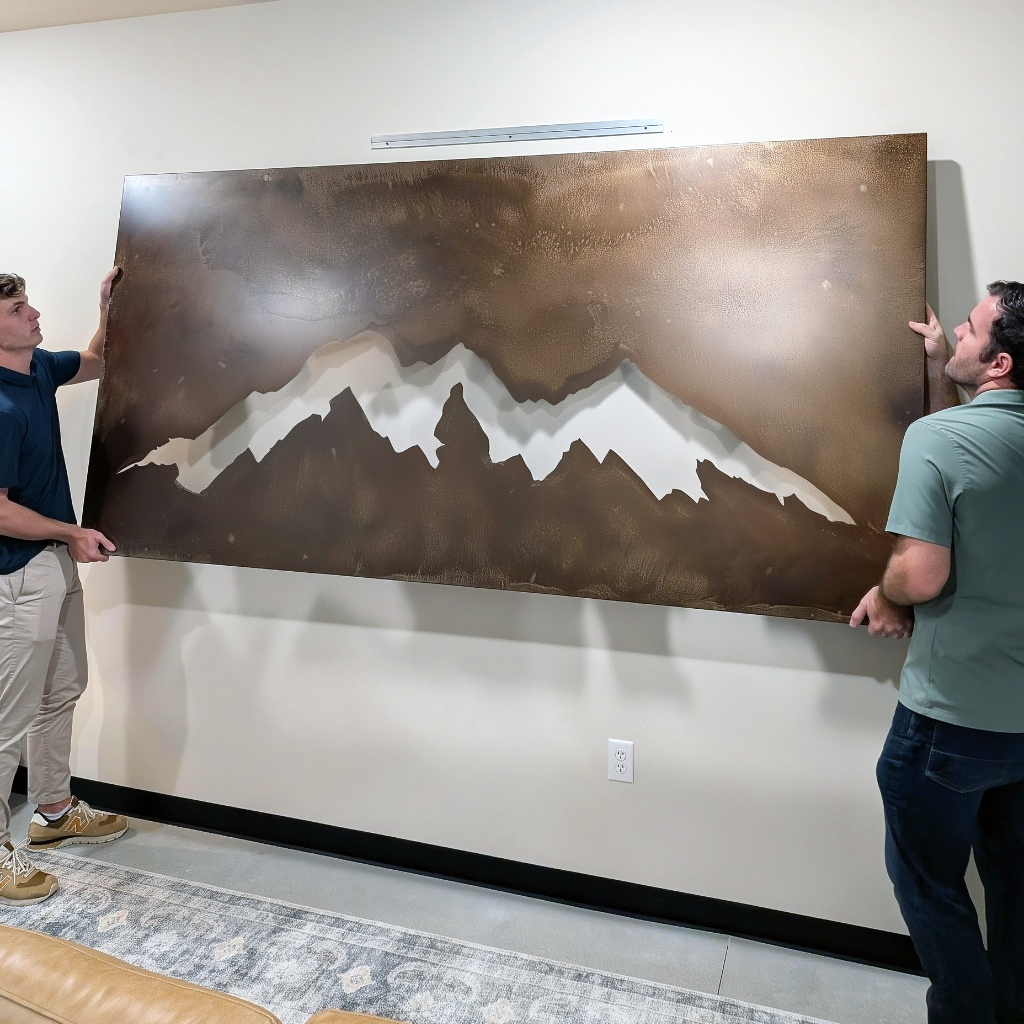 With the help of a friend, lift your metal artwork and hook the top rear lip into the mounted French Cleat until it sits firmly.