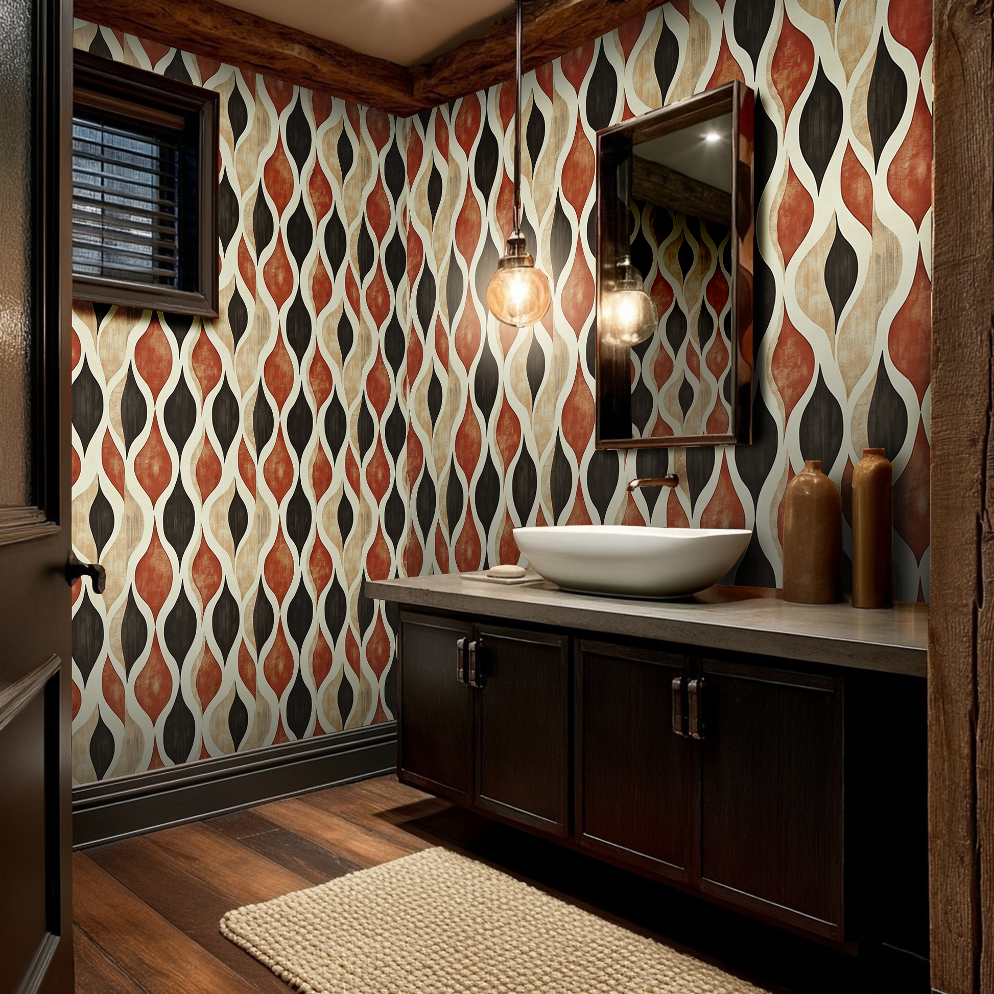 Abernathy is a bold geometric wallpaper defined by sweeping curves and rich earthen tones. The interplay of terracotta, charcoal, and sand creates a warm, dimensional effect that feels both retro and refined. Perfect for accent walls or full-room statements, Abernathy brings a sense of artistry and movement to modern rustic spaces.