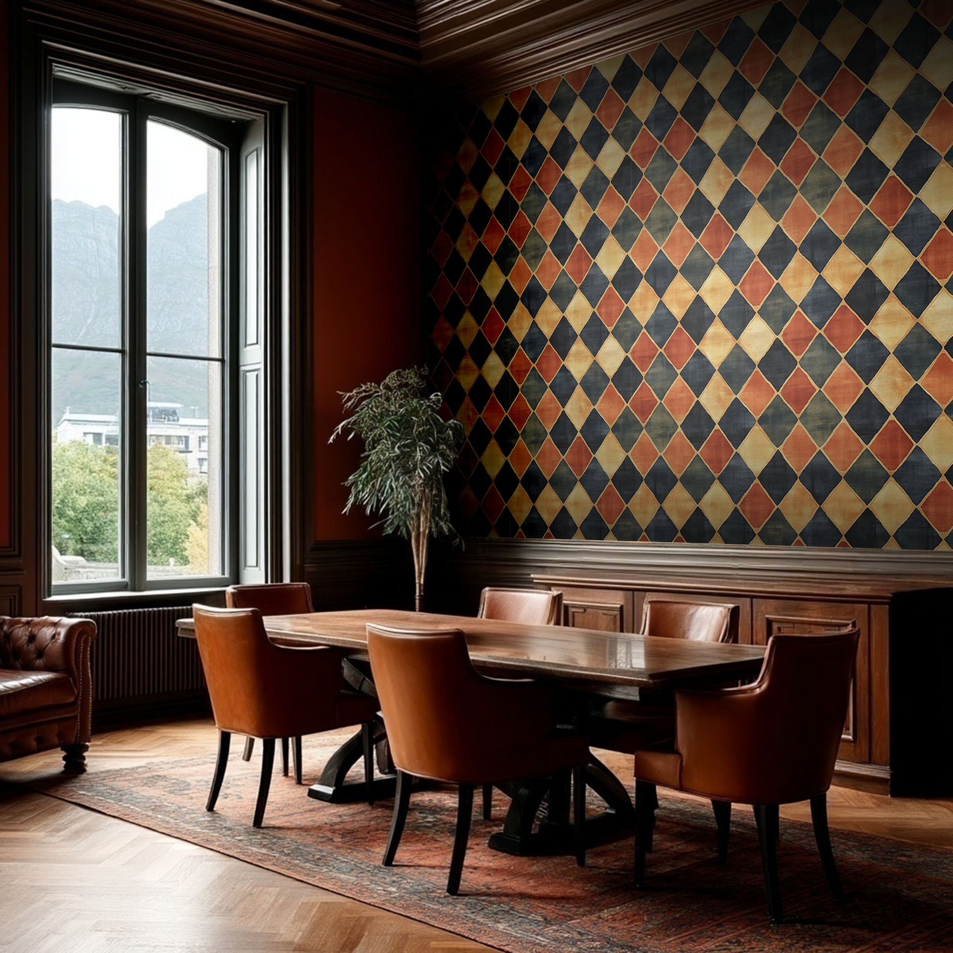Belmont Check is a striking plaid-inspired wallpaper featuring painterly diamonds in deep navy, golden ochre, and rust. The hand-brushed texture gives the geometric pattern warmth and depth, balancing structure with artistry. Both classic and bold, Belmont Check adds richness and character to entryways, offices, and dining spaces alike.