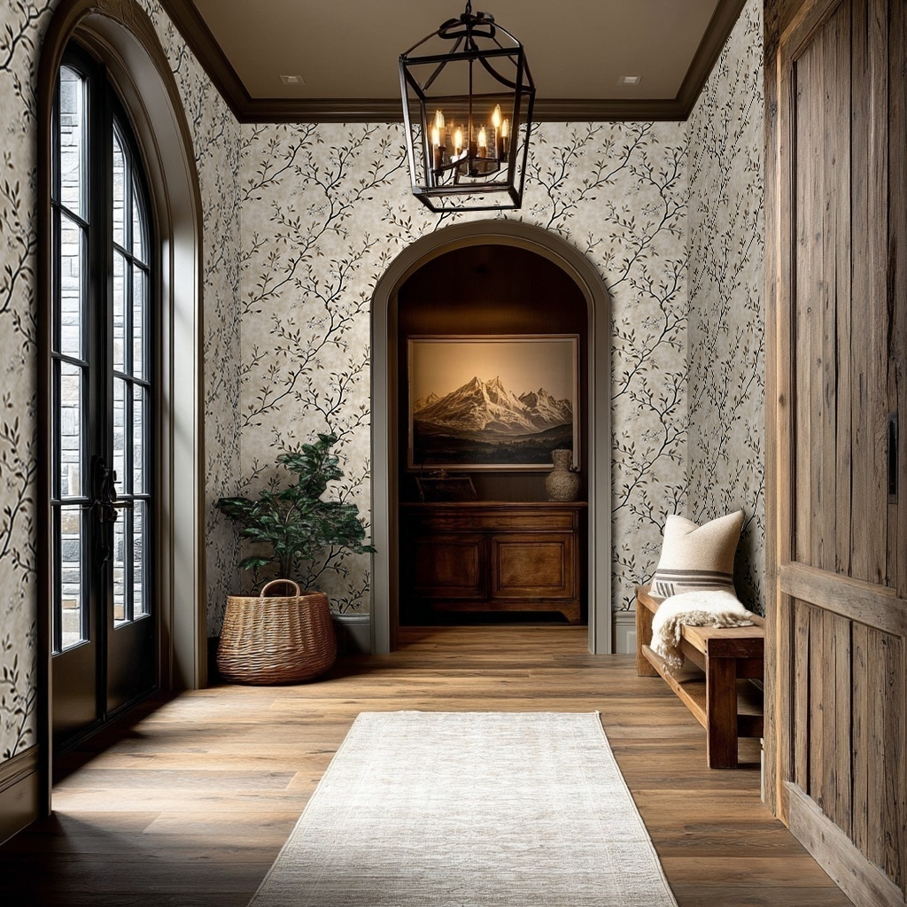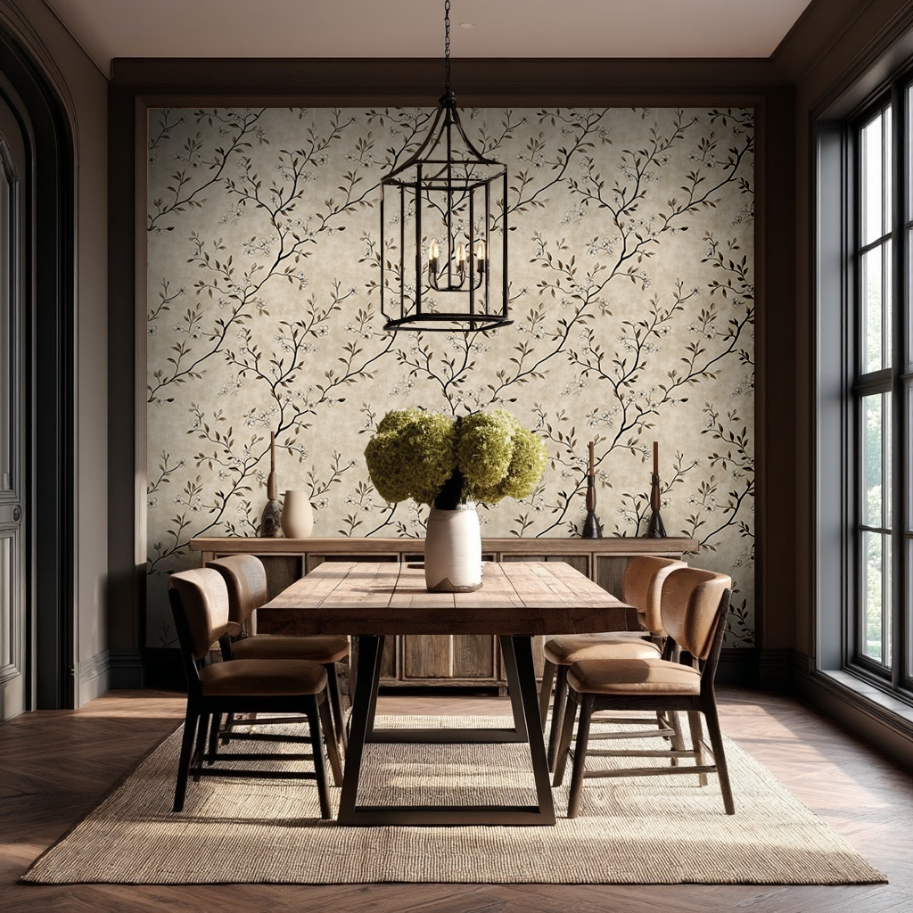 Camden is a graceful botanical wallpaper featuring sweeping branches and delicate blossoms in soft neutral tones. The hand-drawn lines and subtle shading create a natural rhythm that feels both organic and refined. Calm and timeless, Camden brings an understated elegance perfect for bedrooms, dining rooms, or serene living spaces.
