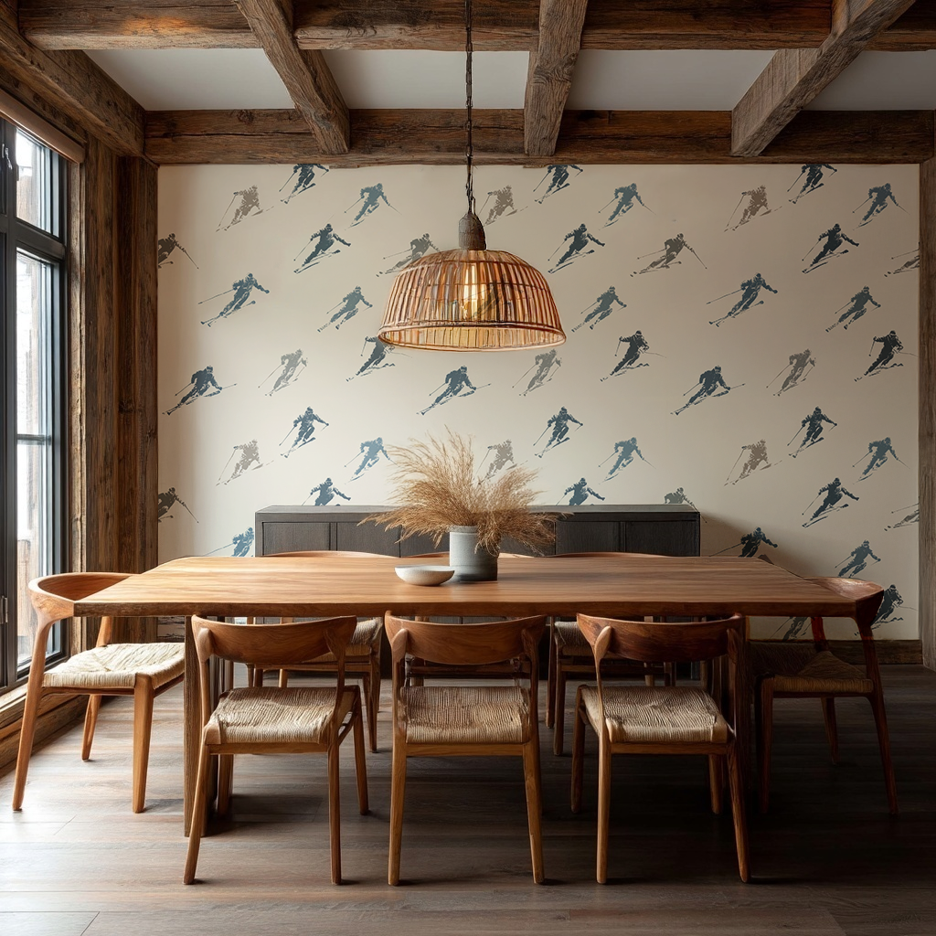 Carver is a ski-themed wallpaper with repeating silhouettes of skiers mid-run. Rendered in crisp shades of blue and taupe, the design balances sport and style. Fresh and graphic, it adds personality to cabins or winter-inspired interiors.