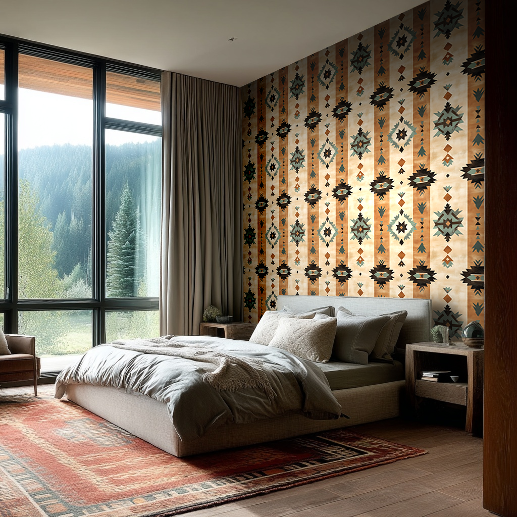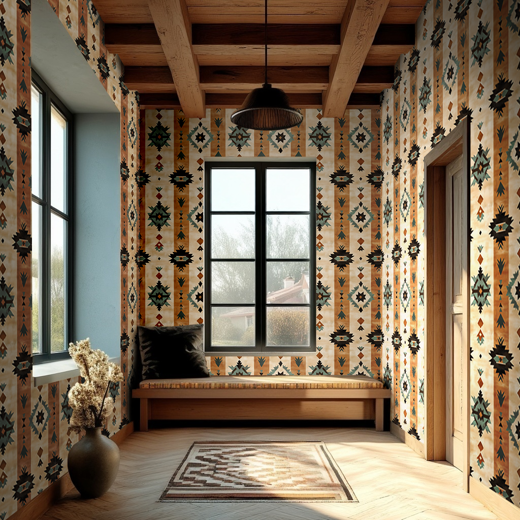 Bring authentic Western charm to your space with Coleridge Wallpaper. This striking design features bold geometric patterns in warm orange and cream tones, perfectly capturing the rustic spirit of ranch-style décor. Ideal for creating an inviting, out-west atmosphere in bedrooms, living rooms, or accent walls, this wallpaper combines timeless Western aesthetics with contemporary geometric appeal. Transform your walls into a statement of rugged elegance that celebrates classic Americana style.