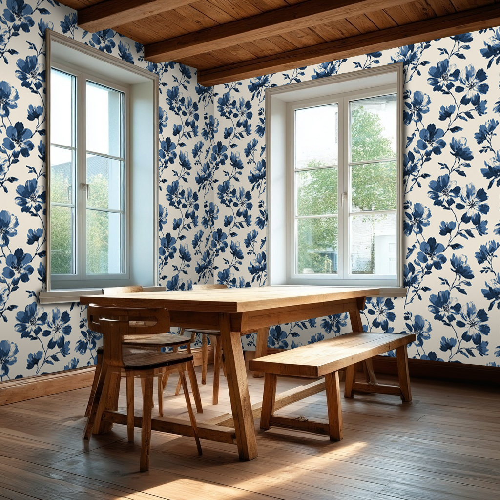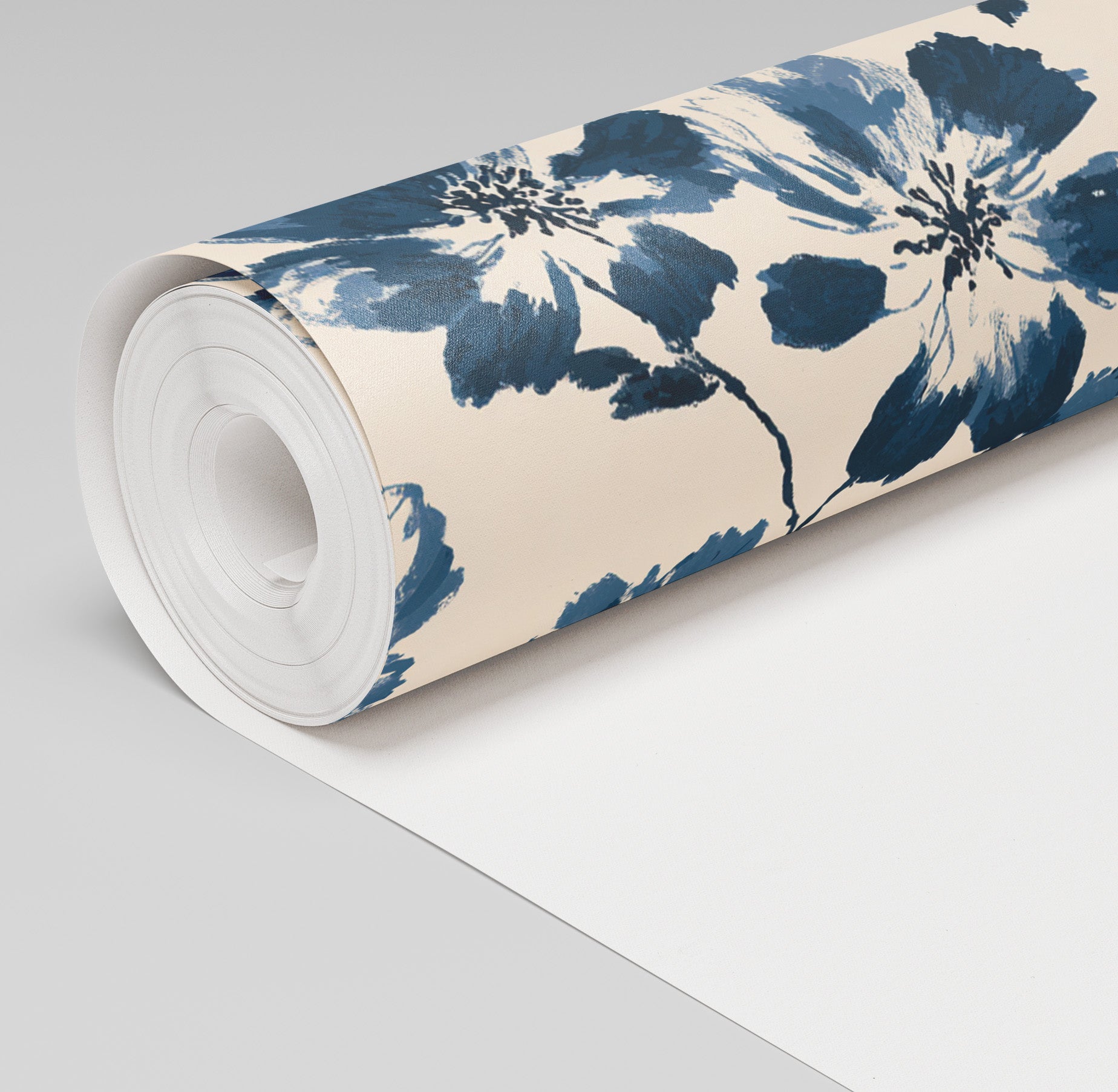 Cordelia is a painterly floral wallpaper with oversized blossoms in layered indigo hues. Expressive brushstrokes give the pattern depth and movement, creating a bold yet balanced look. Striking on its own or as an accent wall, it offers a classic take on statement florals.
