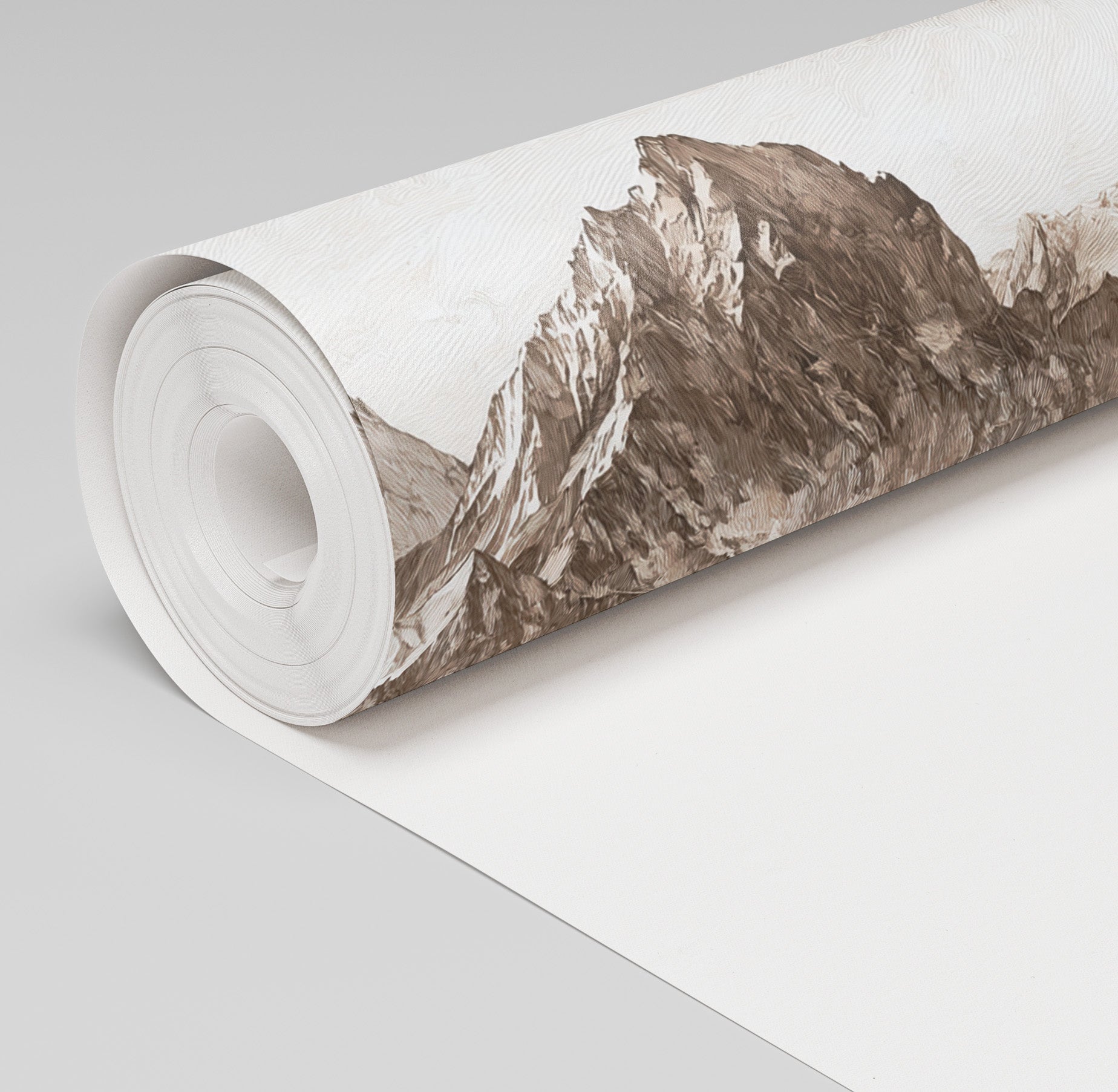 Courtland is a mountain range wallpaper illustrated with fine line detail. The tonal browns and ivory create depth, bringing rugged peaks to life with dramatic texture. It’s a grounded, atmospheric design that works especially well on larger walls.