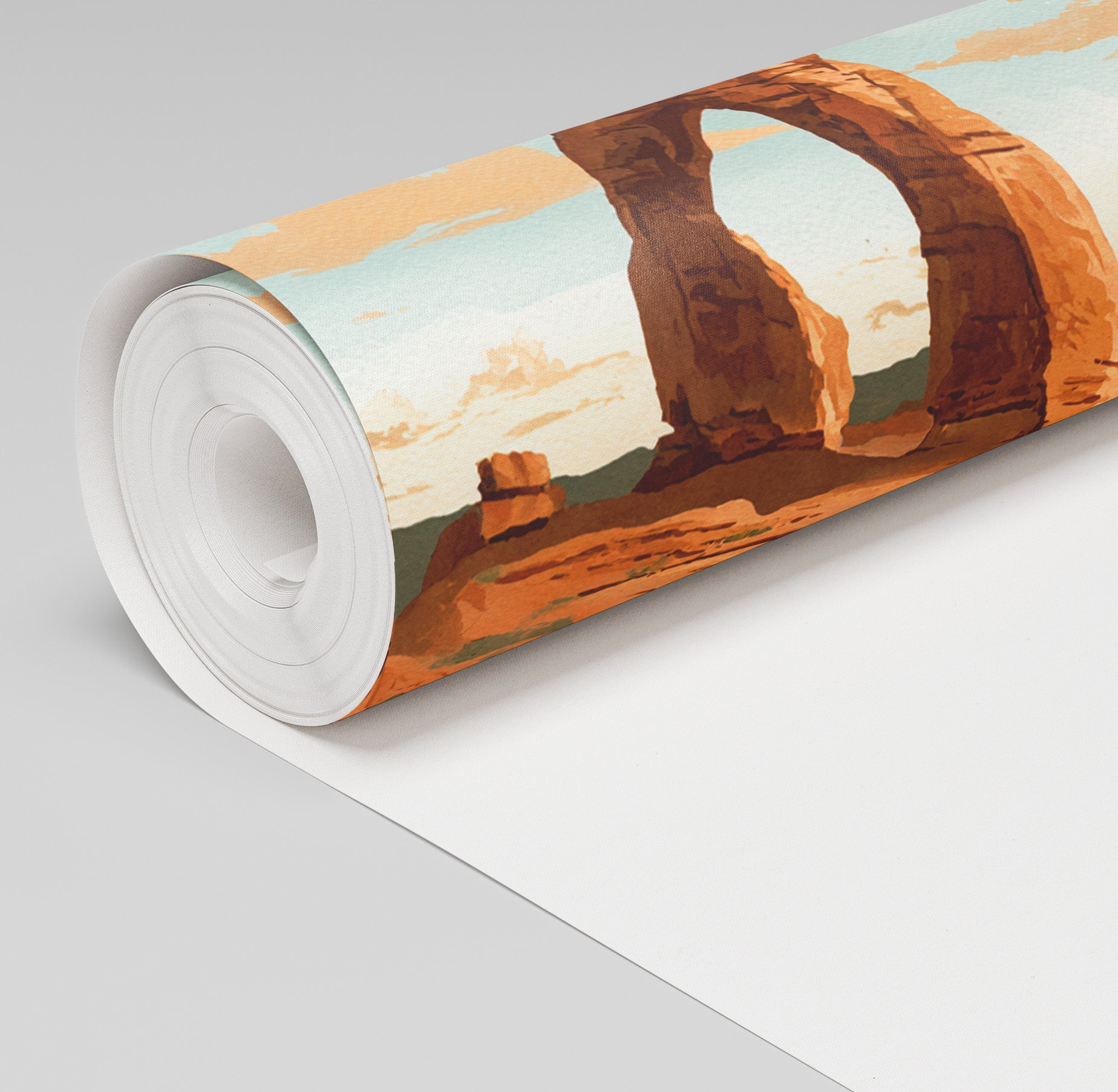 Transform your space with Delicate Arch Wallpaper, inspired by one of America's most iconic natural landmarks. This stunning design captures the warm, earthy tones of the desert landscape, featuring the majestic arch set against layered mountain silhouettes in rich oranges and warm neutrals. Perfect for creating a focal point in any room, this wallpaper brings the timeless beauty of the Southwest into your home. Ideal for those who appreciate national park aesthetics and natural wonder.