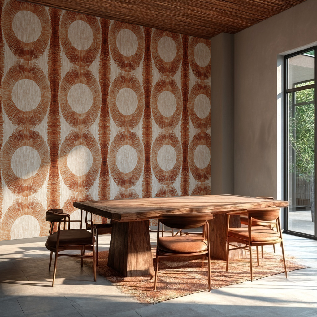 Eden brings modern energy to classic form with its bold concentric design in warm tones of sienna and clay. The organic texture and rhythmic pattern create movement and balance, blending mid-century geometry with natural artistry for a statement that feels both grounded and refined.