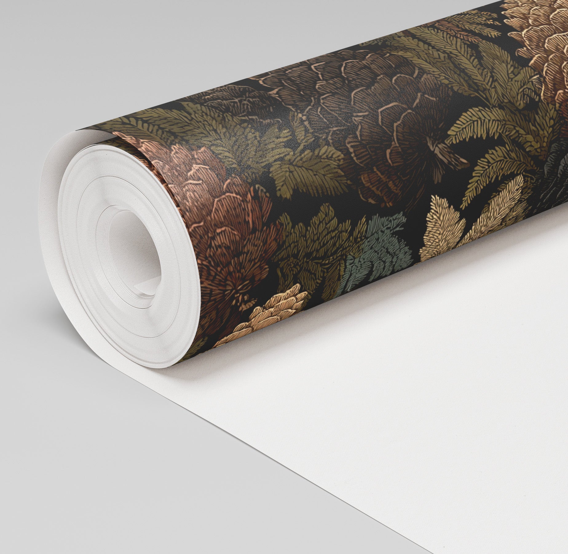 Edmund Pines is a richly detailed wallpaper filled with overlapping pinecones and forest foliage. Warm browns, muted greens, and golden tones create depth against a dark background. The hand-drawn detail gives the design a rugged, textural quality. Ideal for cabins, lodges, or any space where you want to bring in the feel of the woods.