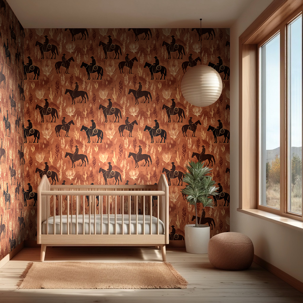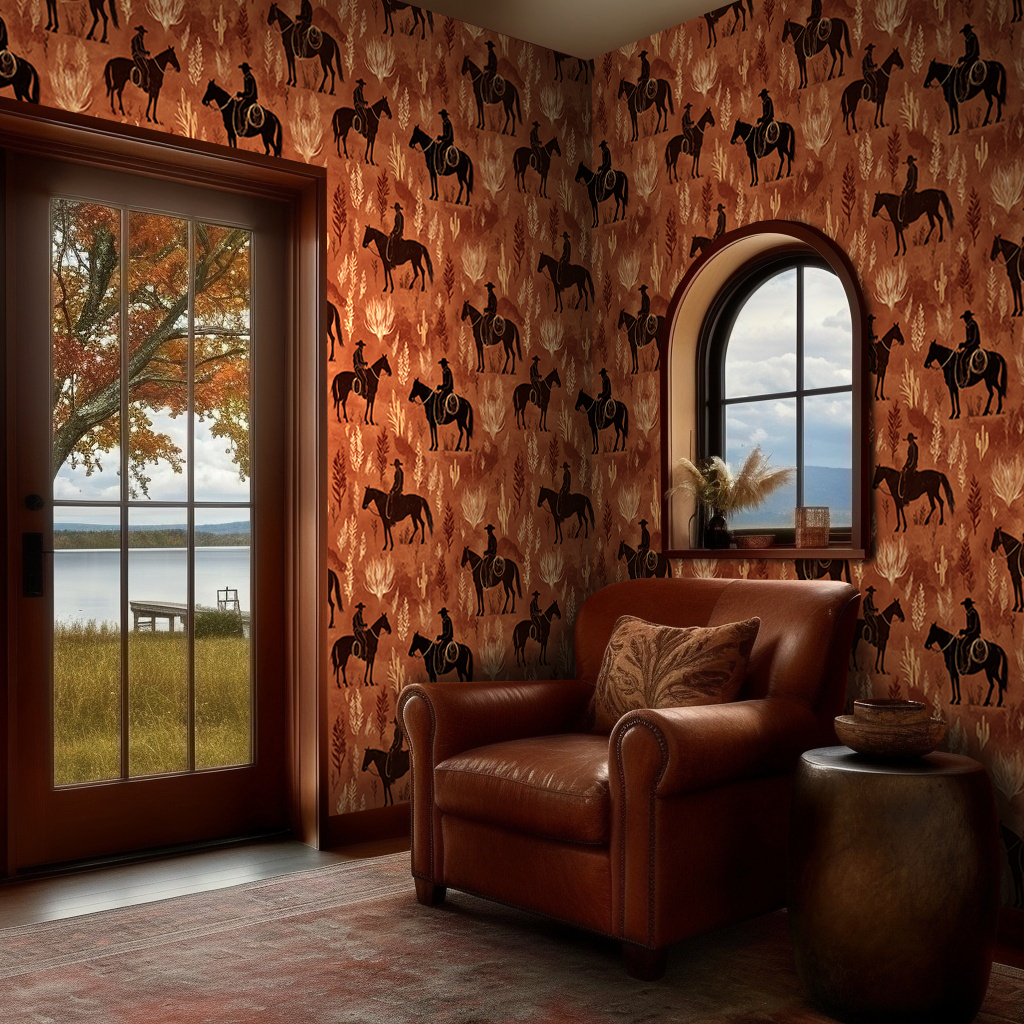 Bring timeless Western charm into your space with Fable Wallpaper, featuring a striking vintage-inspired horse motif in warm orange tones. This classic design captures the spirit of the Old West with authentic period aesthetics, perfect for creating a distinctive focal point in any room. Ideal for those who appreciate equestrian heritage and nostalgic Americana style, this wallpaper adds character and warmth to bedrooms, dens, or living spaces. Transform your walls with a piece that tells a story of the frontier.