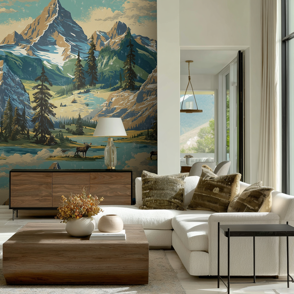 Transform your walls with this stunning Glacier Wallpaper featuring breathtaking mountain landscapes inspired by America's most iconic national parks. The serene blend of cool blues and rich greens captures the majesty of pristine alpine scenery, bringing the tranquility of nature indoors. Perfect for creating a focal point in any room, this design evokes the grandeur of untouched wilderness while maintaining an elegant, sophisticated aesthetic. Ideal for nature enthusiasts and those seeking to infuse their space with natural beauty and peaceful mountain vistas.