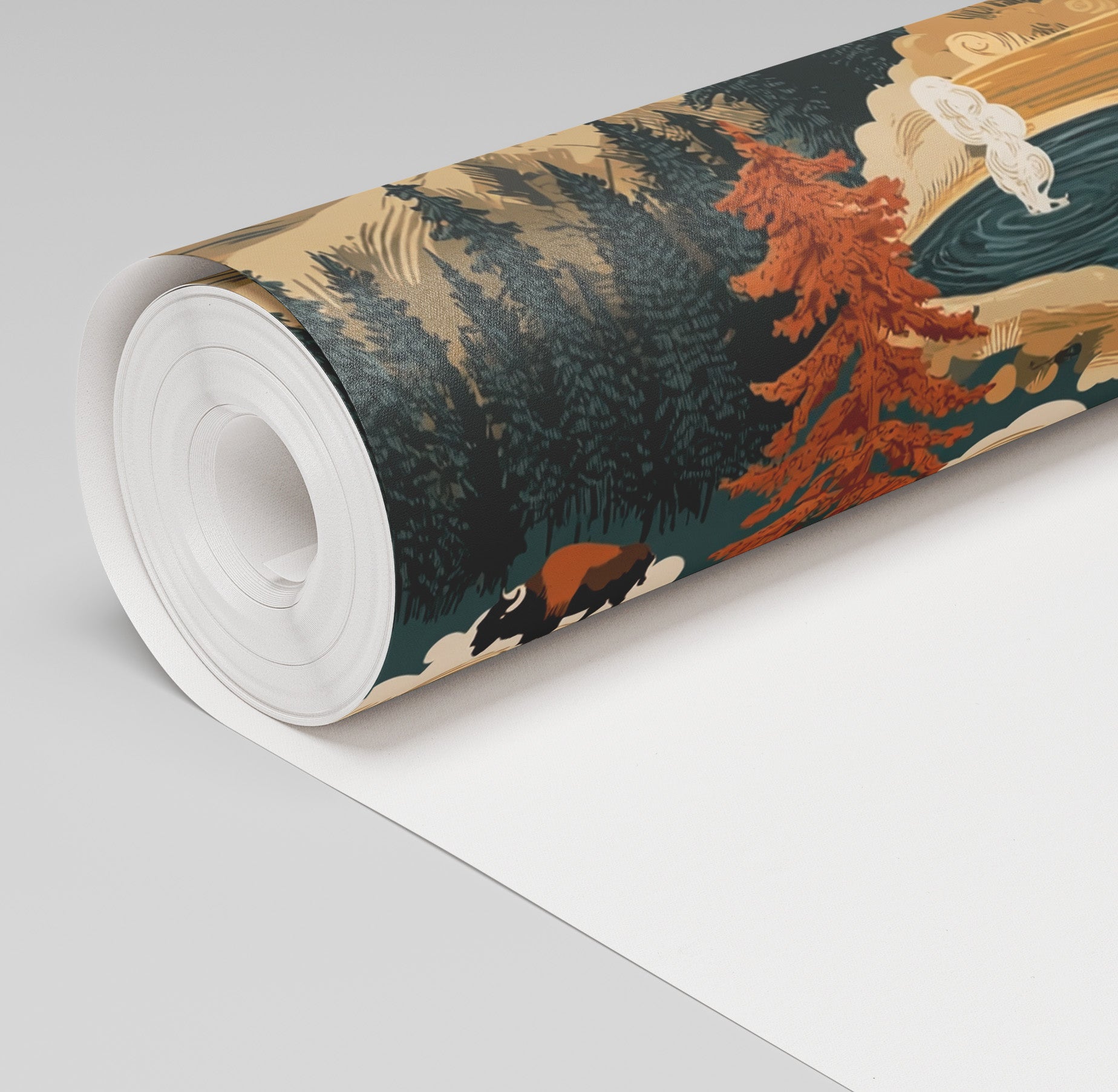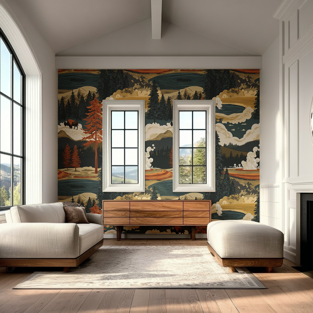 Bring the serene beauty of Hayden Valley into your home with this stunning wallpaper design. Featuring warm orange and cool blue tones inspired by natural landscapes, this rustic pattern captures the essence of America's most iconic national parks. Perfect for creating an accent wall or transforming an entire room, the earthy color palette and nature-inspired motifs add depth and character to any space. Ideal for those seeking to infuse their interiors with outdoor charm and timeless appeal.
