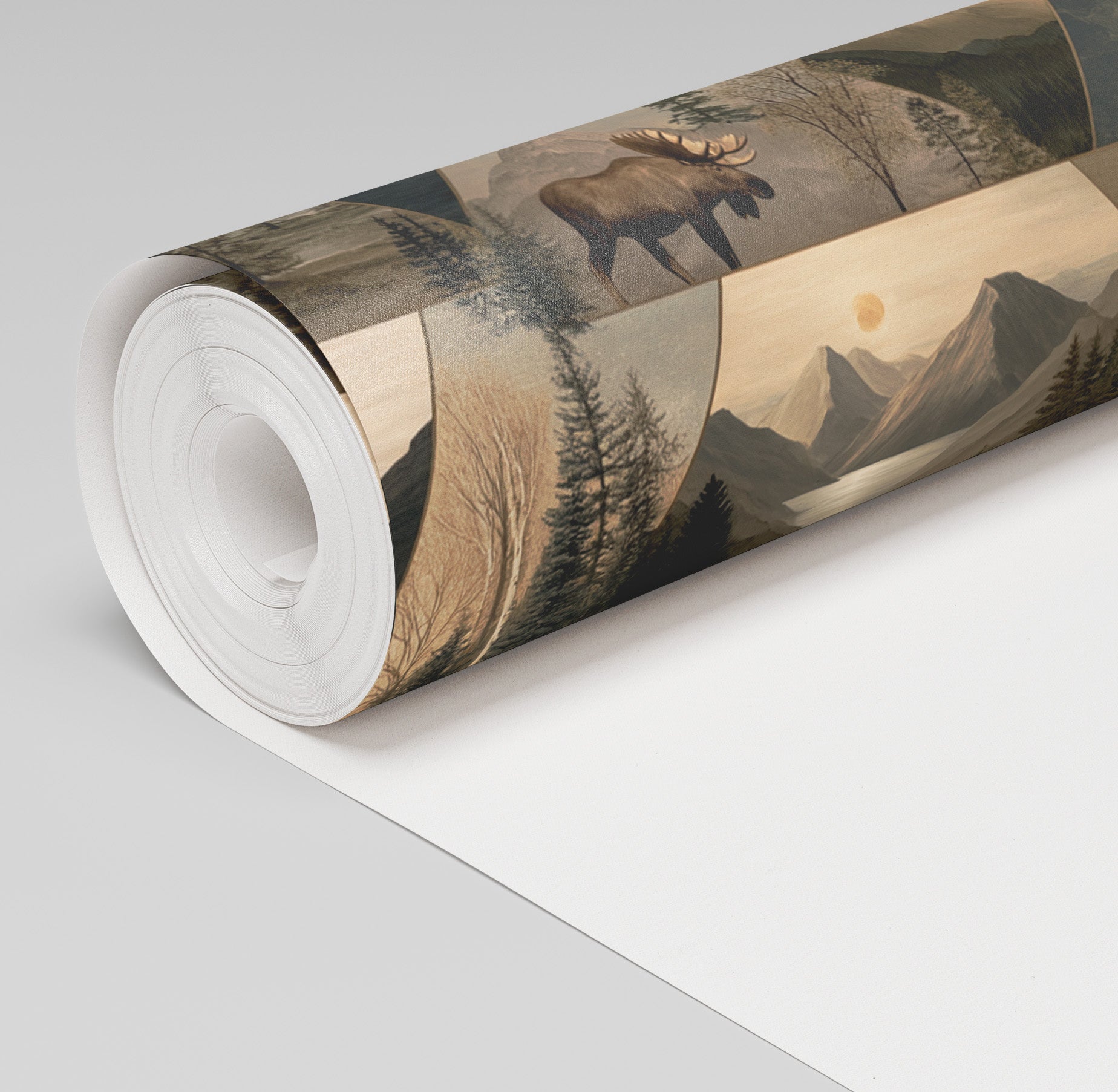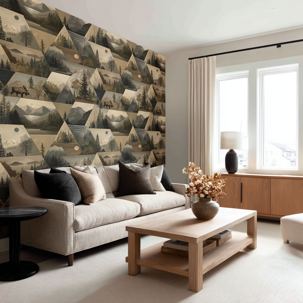 Transform your space with Hidden Lake Wallpaper, featuring a sophisticated blend of muted blue and green tones arranged in a subtle geometric pattern. The design incorporates a striking bison motif, bringing natural elegance and a touch of wildlife-inspired character to any room. Perfect for creating a calming, nature-forward aesthetic that complements both modern and traditional interiors. This wallpaper adds depth and visual interest while maintaining a refined, understated appeal that works beautifully as a statement wall or throughout your home.