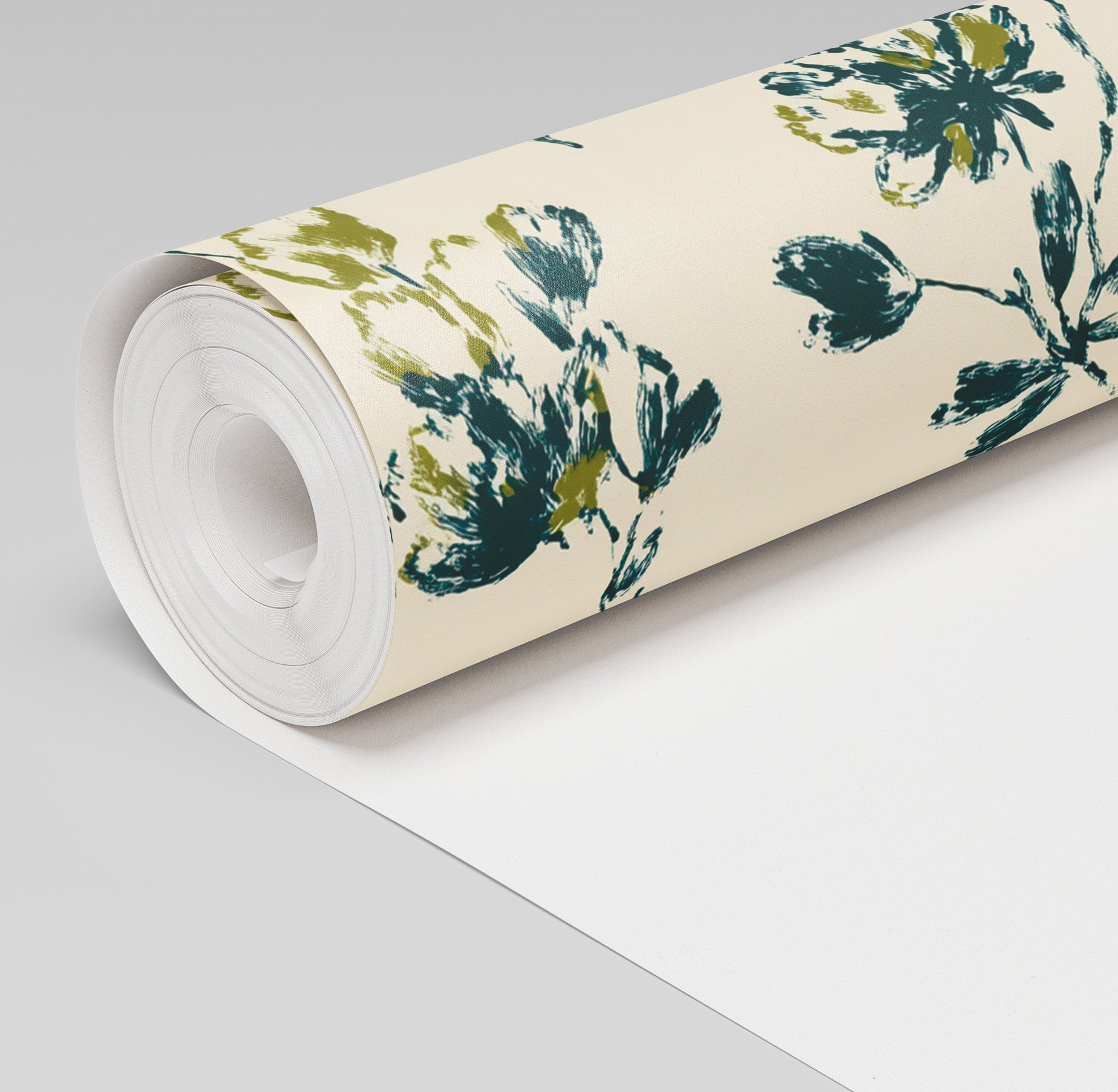 Margaux is a painterly floral wallpaper with blossoms in deep green and golden tones. The loose brushstrokes give the flowers a lively, textured appearance against a soft cream ground. Both expressive and refined, it’s perfect for feature walls that need movement and color without overwhelming.