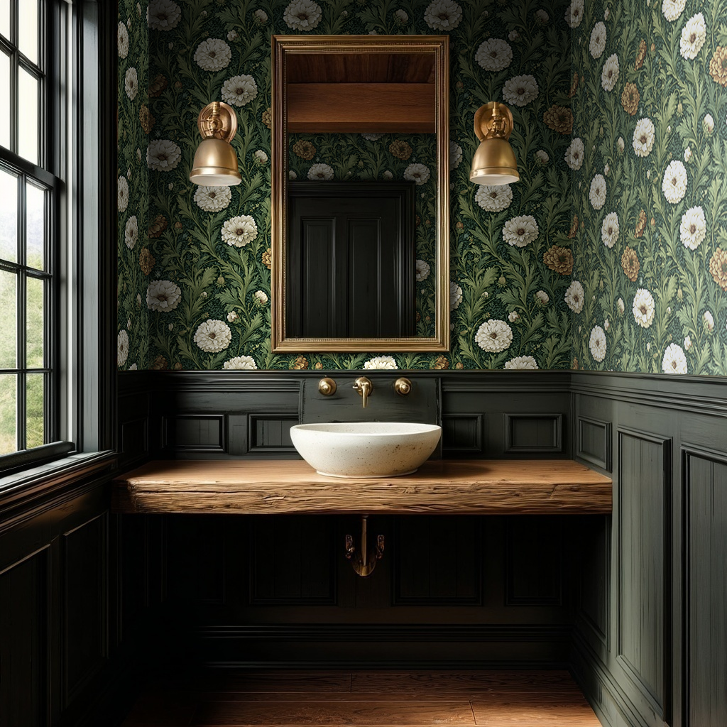 Marguerite is a lush botanical wallpaper featuring large cream blooms surrounded by layers of leafy greenery. The dark background makes the flowers appear full and dimensional, while touches of warm brown add depth. The repeating pattern feels rich and timeless, perfect for rustic or traditional interiors.