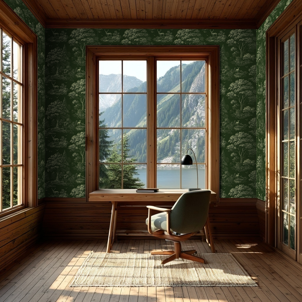 Milton is a woodland toile wallpaper with deer, trees, and birds etched in soft line work. Set against a dark green ground, the design layers natural scenes in a repeating layout. Rugged and refined, it brings the calm of the outdoors into any interior.