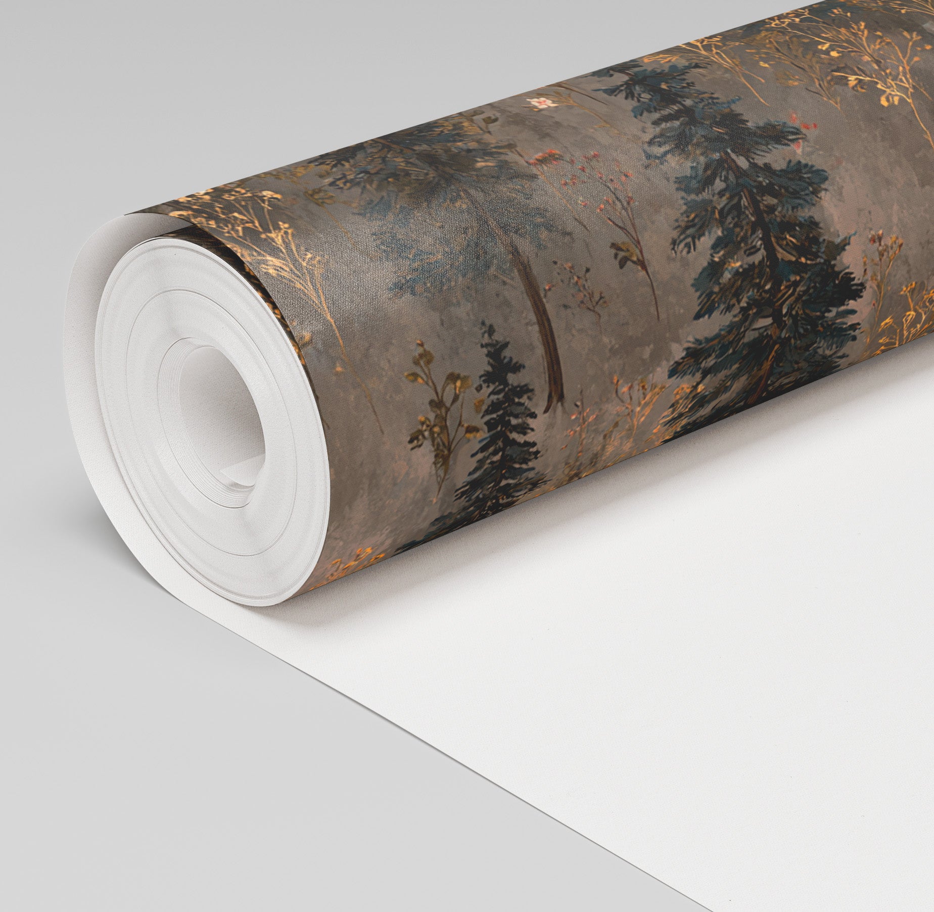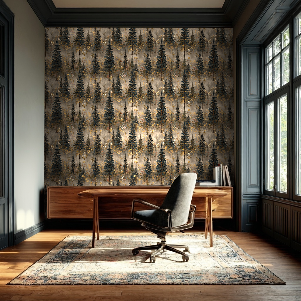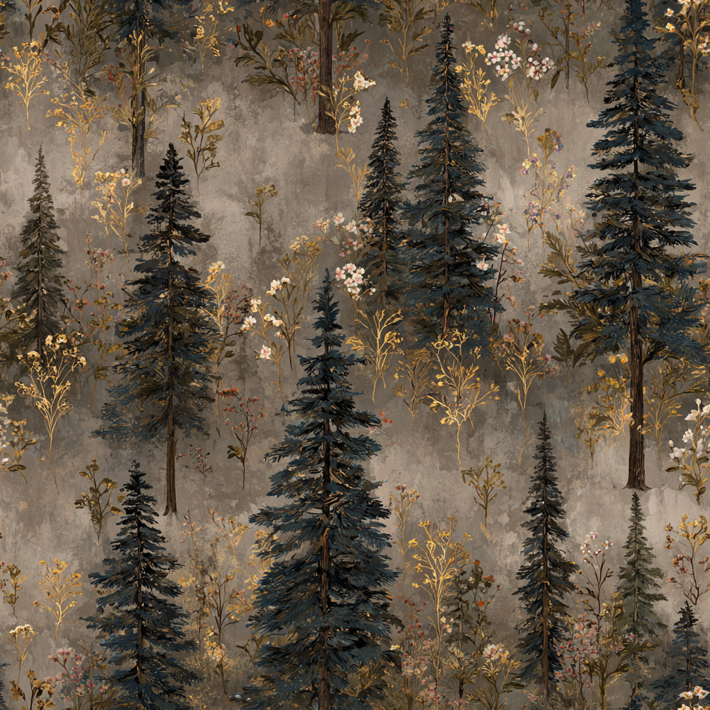 Octavia is a forest-inspired wallpaper with tall evergreens set among golden wildflowers. The textured gray ground adds depth, while the layered florals soften the vertical tree forms. Rich in detail and mood, it’s an ideal backdrop for cozy or rustic spaces.