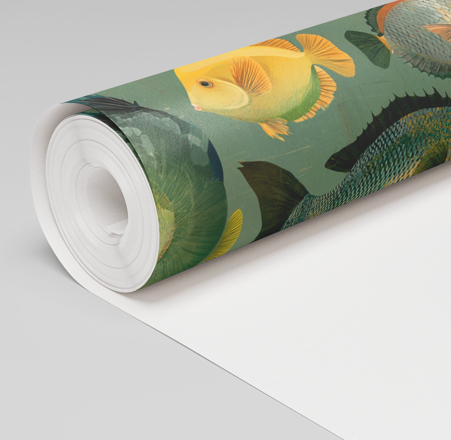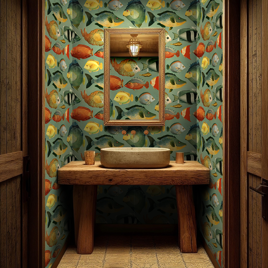 Rupert is a coastal wallpaper featuring a collection of colorful fish painted in shades of red, yellow, green, and blue. Each fish is highly detailed, with scales and fins rendered in a vintage illustration style. Playful yet classic, it adds personality to kitchens, lake houses, or bathrooms.