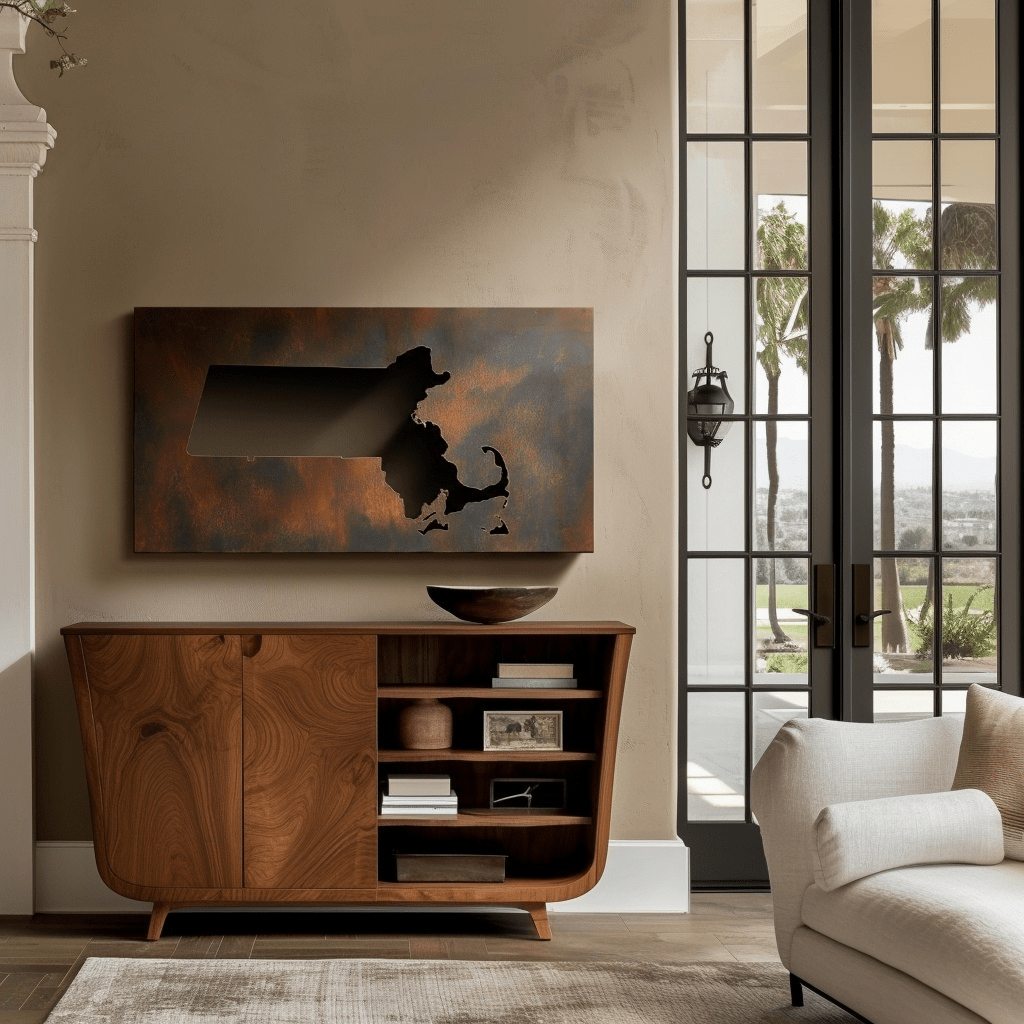 Each piece is crafted from solid 14-gauge American steel and precision cut for clean, lasting lines. A hand-applied patina gives every piece its own unique character. No two are exactly alike. Once finished, the piece is sealed for long-term durability.