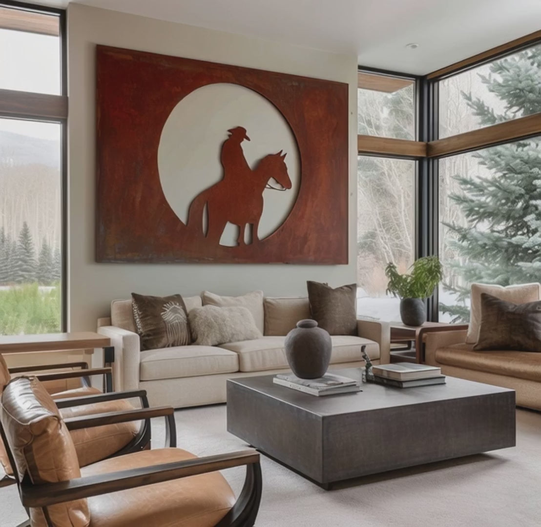 A lone cowboy on horseback, silhouetted against a perfect full moon. The Moonrider is both iconic and cinematic, balancing motion with solitude. The circular cutout frames the rider like a memory suspended in time, casting a warm glow that turns steel into story.