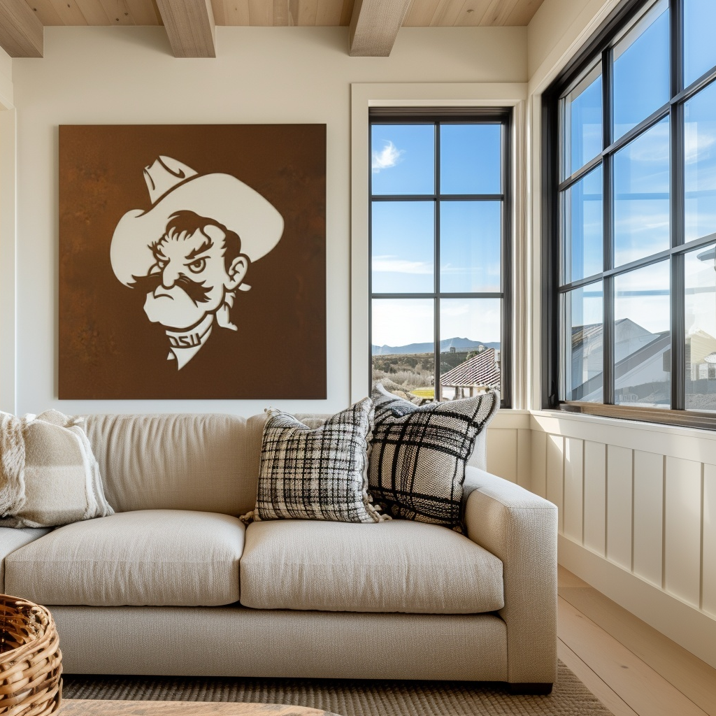 A bold tribute for devoted Cowboys fans, this steel-cut wall art showcases the iconic mascot with striking detail. Crafted from solid steel and mounted for depth, it casts a sharp shadow that makes the piece come alive in any space.