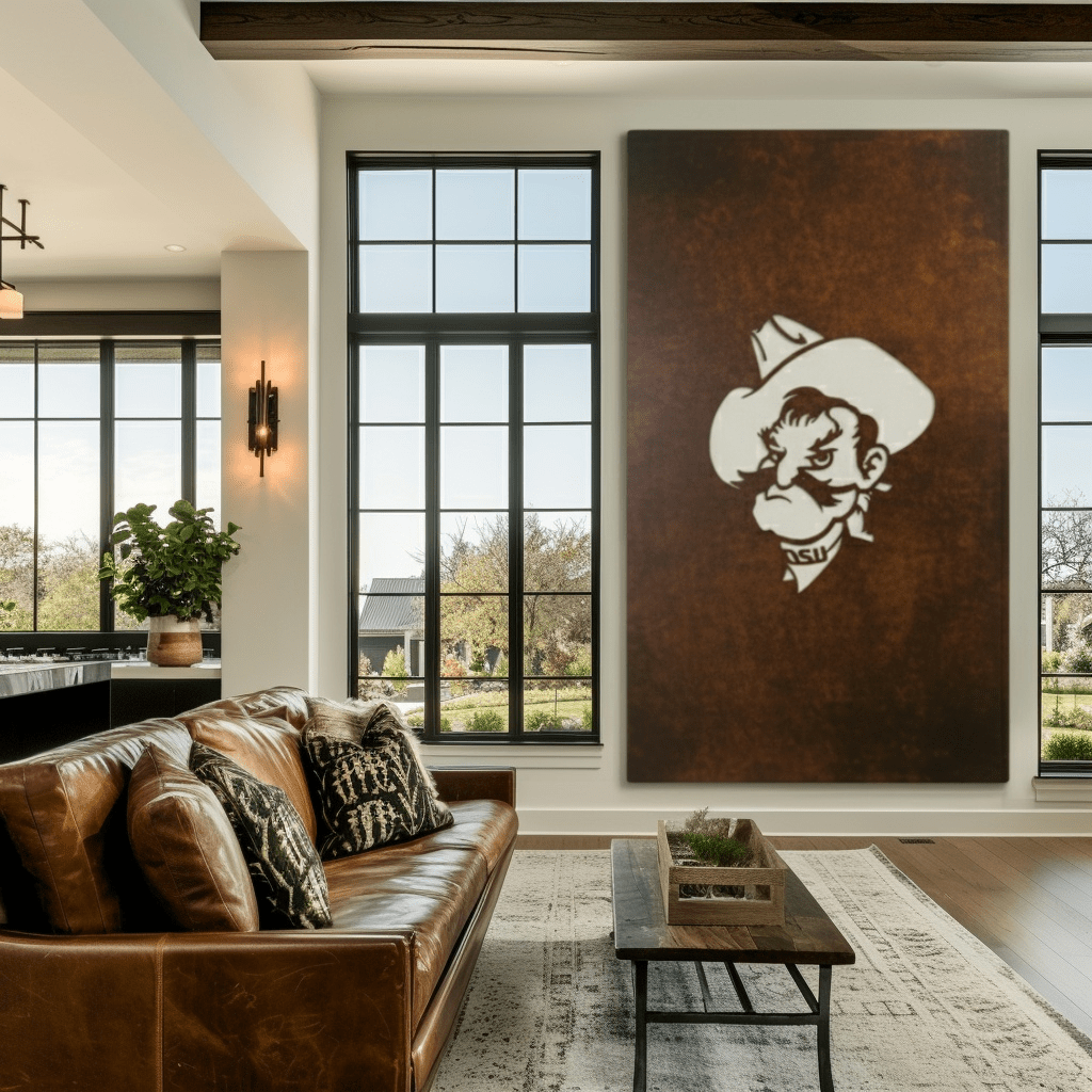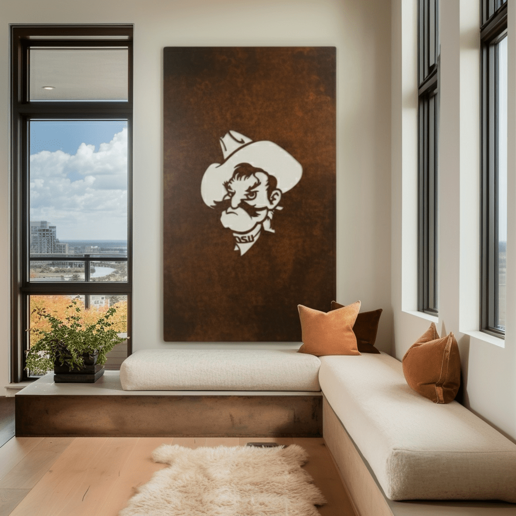 Each piece is crafted from solid 14-gauge American steel and precision cut for clean, lasting lines. A hand-applied patina gives every piece its own unique character. No two are exactly alike. Once finished, the piece is sealed for long-term durability.