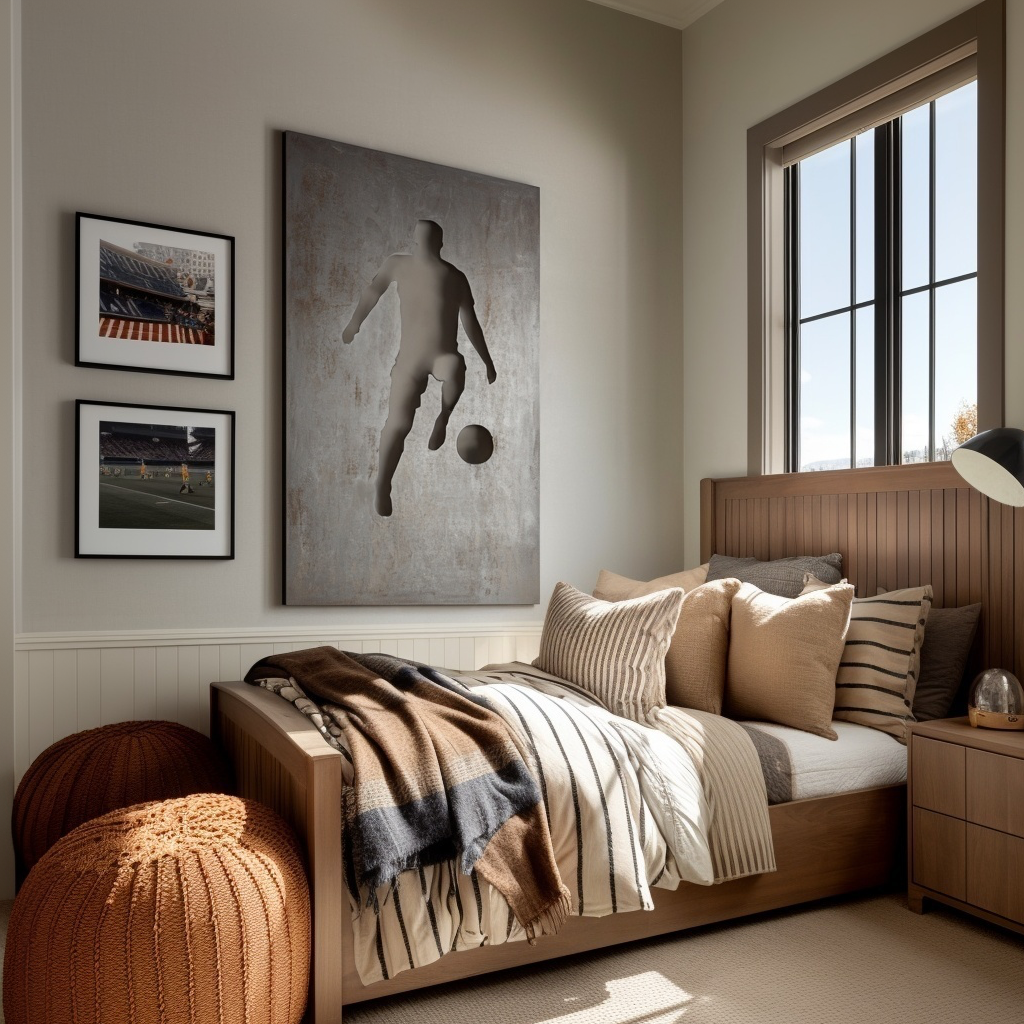 A patinaed steel silhouette of a soccer player mid-dribble, The Striker channels the speed and anticipation of the game.