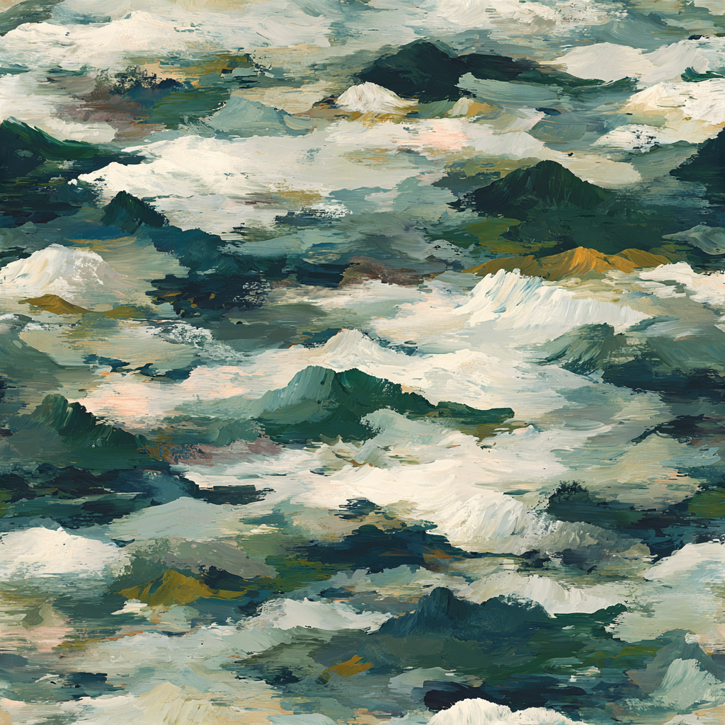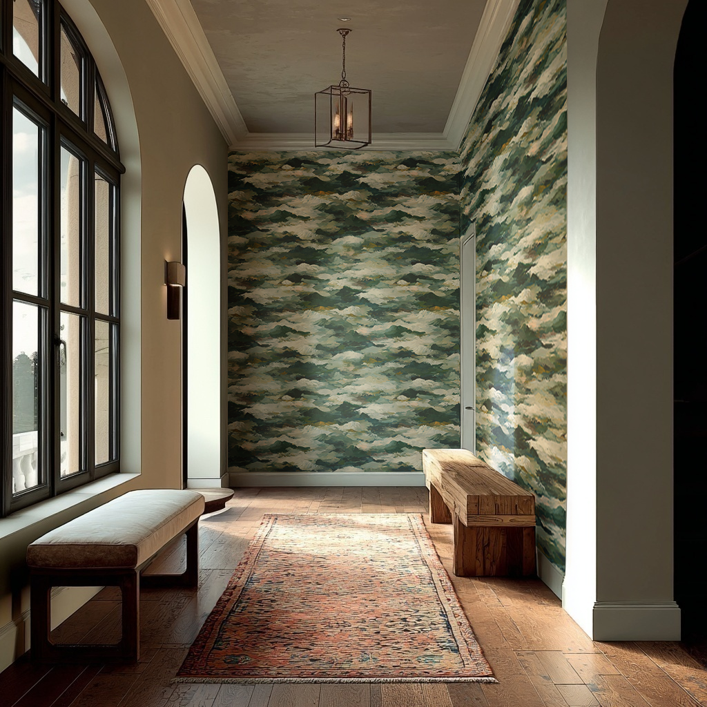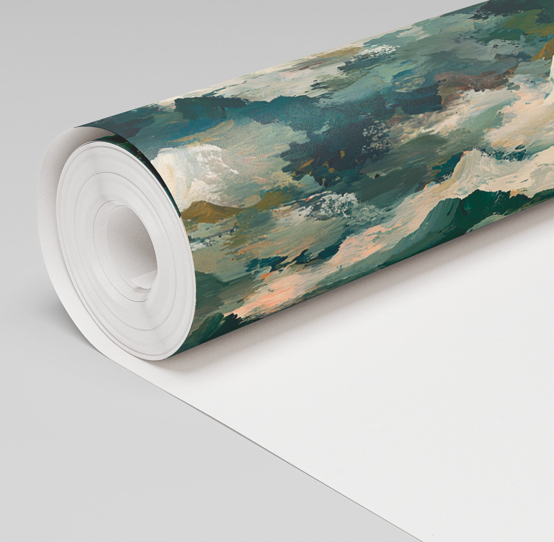 Theodora is an abstract landscape wallpaper with sweeping strokes of green, blue, and white. The layered brushwork creates the impression of rolling hills and clouds, giving walls a sense of movement and depth.