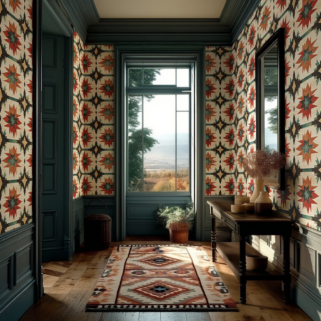 Tremont Wallpaper brings bold geometric patterns and warm western-inspired hues to any room. Featuring striking red and orange tones, this design combines contemporary geometric shapes with classic western aesthetics for a distinctive look. Perfect for accent walls or complete room transformations, Tremont adds character and visual interest while maintaining a sophisticated appeal. Transform your space with this eye-catching wallpaper that balances modern design with timeless western charm.